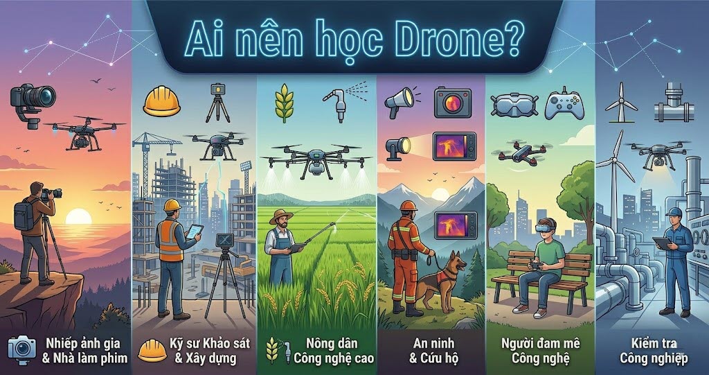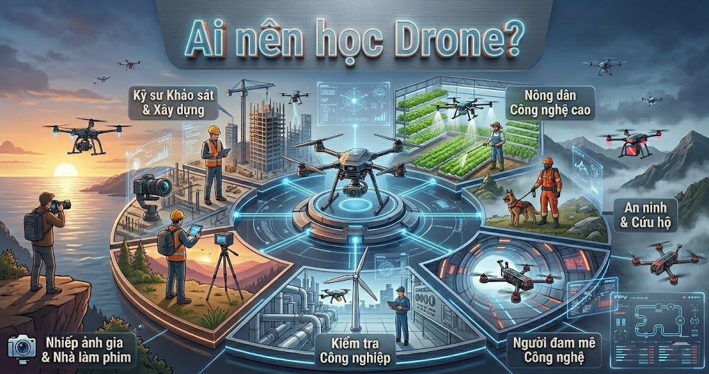 Drone là lựa chọn phù hợp cho những người có nền tảng kỹ thuật, mong muốn tham gia vào ngành công nghệ mới, có khả năng kết nối AI, Robotics và Logistics, đồng thời muốn đón đầu xu hướng trong vài năm tới. Drone không còn là câu chuyện của tương lai xa mà đang dần trở thành một phần của hạ tầng kinh tế mới. Những người học sớm, hiểu hệ thống sớm và tham gia vào chuỗi giá trị sớm sẽ sở hữu lợi thế cạnh tranh rõ rệt trên thị trường lao động trong kỷ nguyên kinh tế tầm thấp.