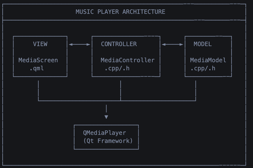 Trong quá trình triển khai, nhóm áp dụng mô hình kiến trúc phân lớp kết hợp MVVM đặc thù của Qt Quick nhằm đảm bảo sự tách biệt giữa giao diện và logic xử lý. Ứng dụng sử dụng giao thức HTTPS để kết nối API, tự động gửi yêu cầu đến Open-Meteo dựa trên tọa độ GPS và xử lý dữ liệu JSON theo thời gian thực. Module Media Player được thiết kế theo mô hình MVC, giúp quản lý tốt luồng dữ liệu và giao diện người dùng.