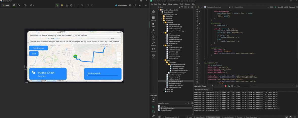 Sản phẩm hoàn thiện sở hữu giao diện trực quan, khả năng hiển thị và theo dõi lộ trình ổn định, hoạt động mượt mà trên nền tảng Qt và dễ dàng mở rộng thêm các tính năng mới. Việc kết nối hiệu quả giữa QML và C++ theo mô hình MVC giúp luồng dữ liệu rõ ràng, tạo nền tảng tốt cho việc phát triển các ứng dụng Automotive phức tạp hơn trong tương lai.