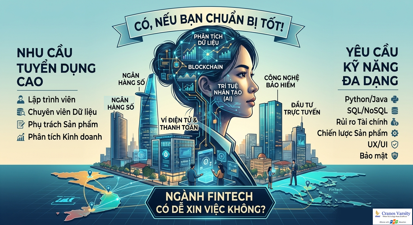 Ngành FinTech có dễ xin việc không? Khám phá nhu cầu tuyển dụng, kỹ năng cần thiết và vai trò của AI trong lĩnh vực tài chính công nghệ tại FPT Cranes.