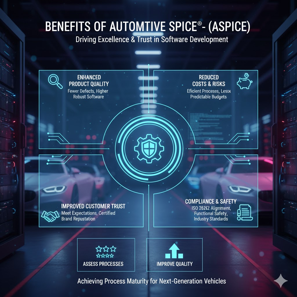 ASPICE đóng vai trò quan trọng trong việc đảm bảo chất lượng, độ tin cậy và an toàn cho các hệ thống trong xe – từ ECU điều khiển phanh, hệ thống hỗ trợ lái nâng cao (ADAS) cho đến nền tảng tự hành. Việc áp dụng ASPICE giúp doanh nghiệp hạn chế rủi ro lỗi hệ thống, nâng cao tính ổn định của phần mềm và đáp ứng các tiêu chuẩn an toàn nghiêm ngặt như ISO 26262.